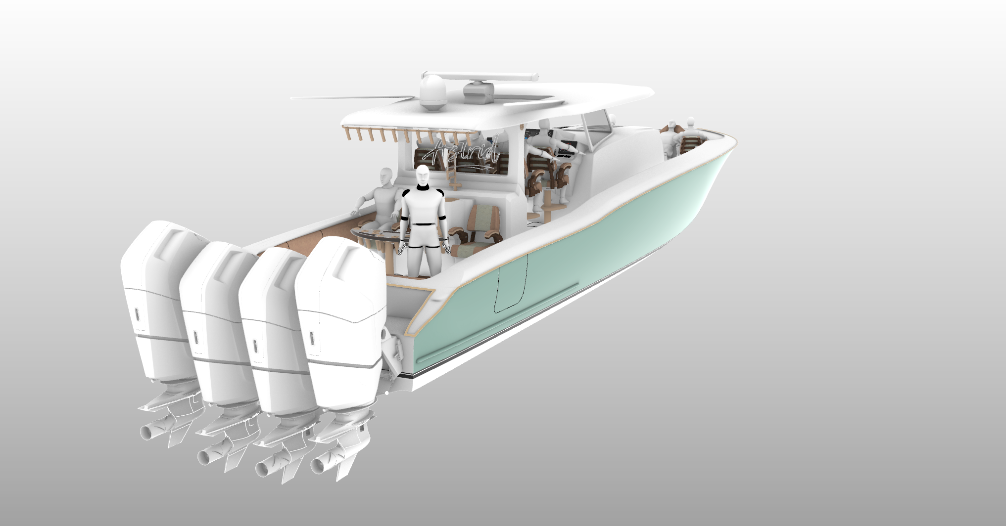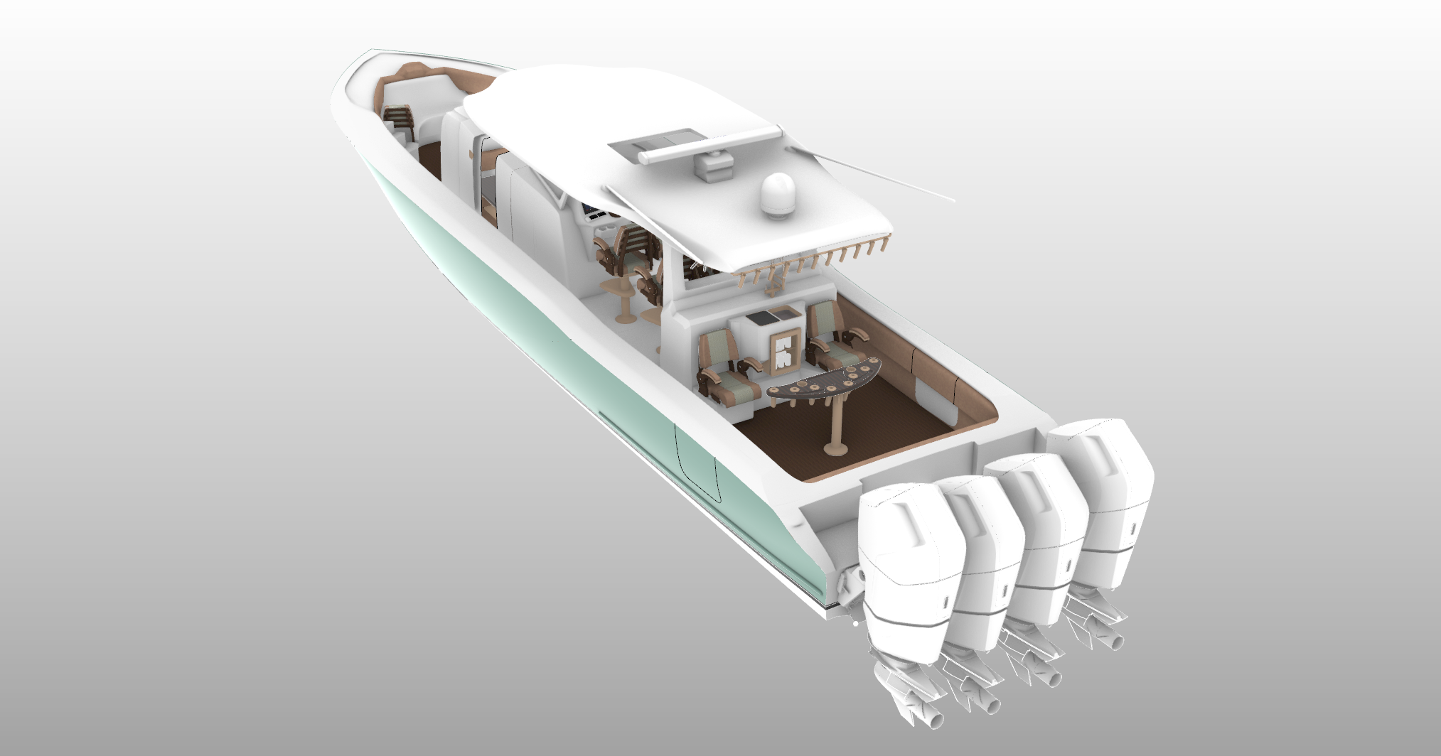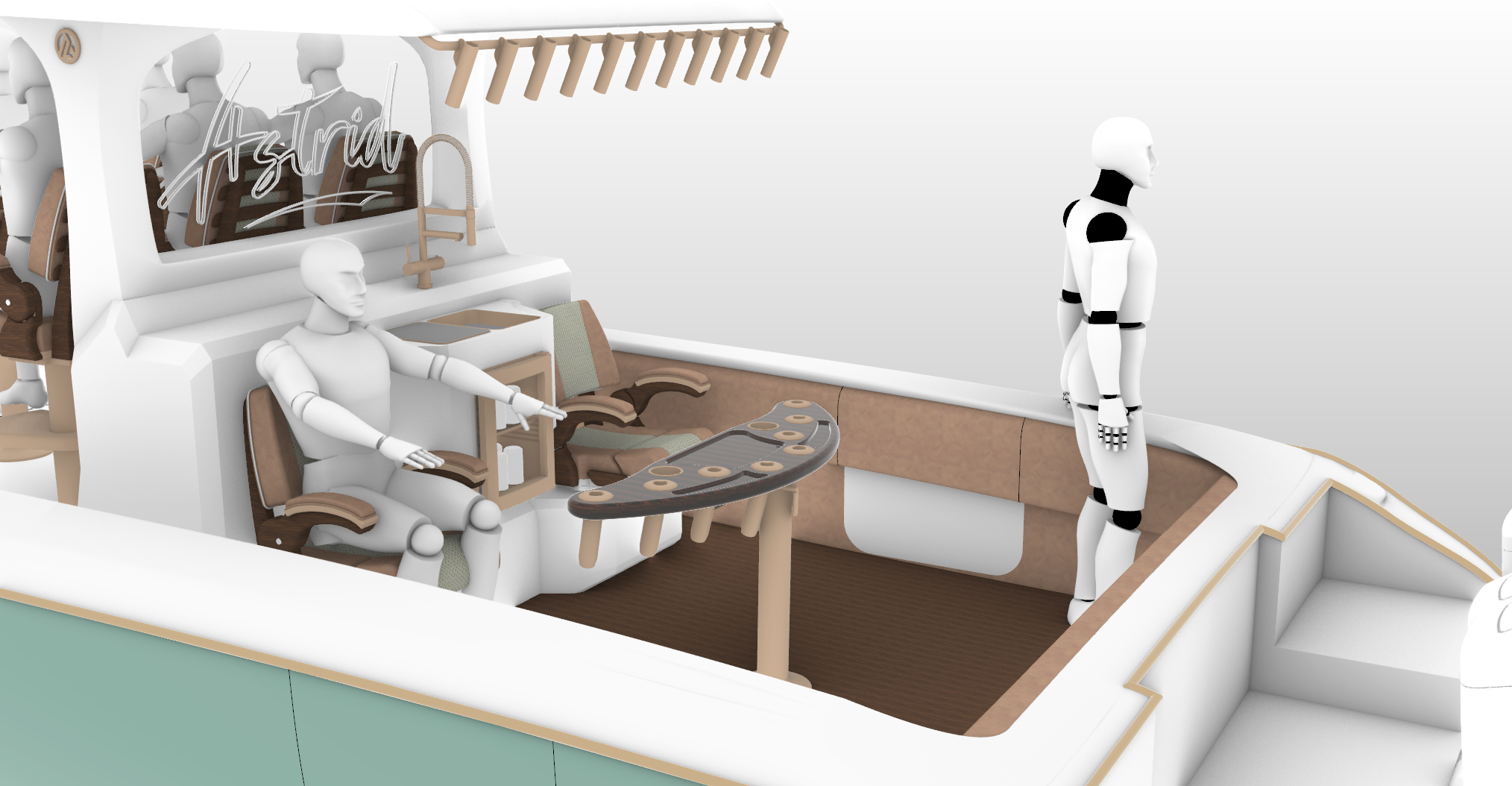 This is the L50 Astrid. Helm chairs/aft lounge chairs as well as forward seat backs and rocket launcher table credited to Release Marine.