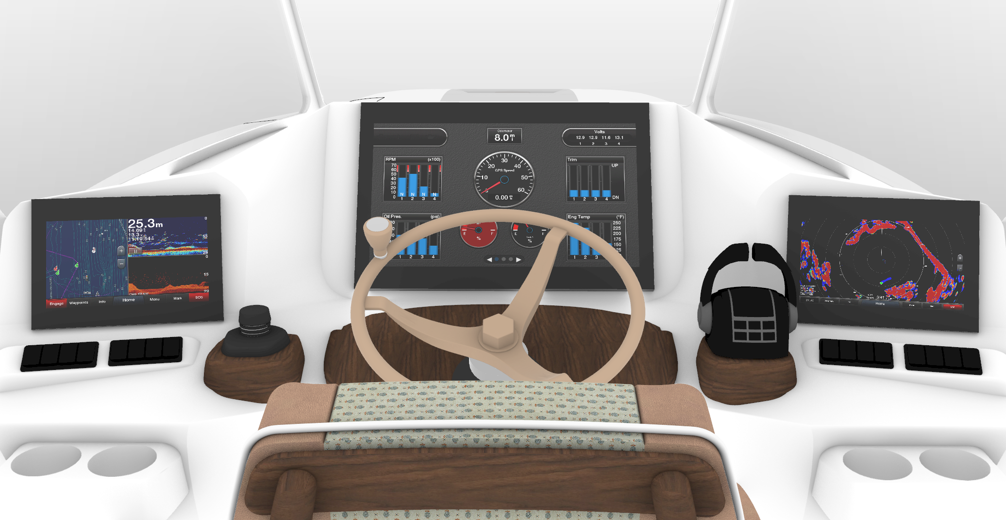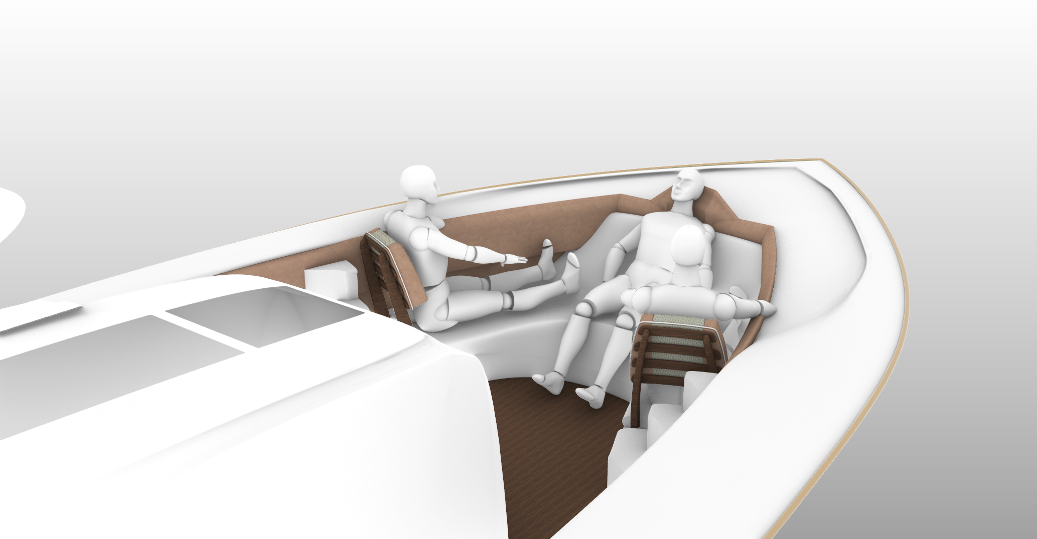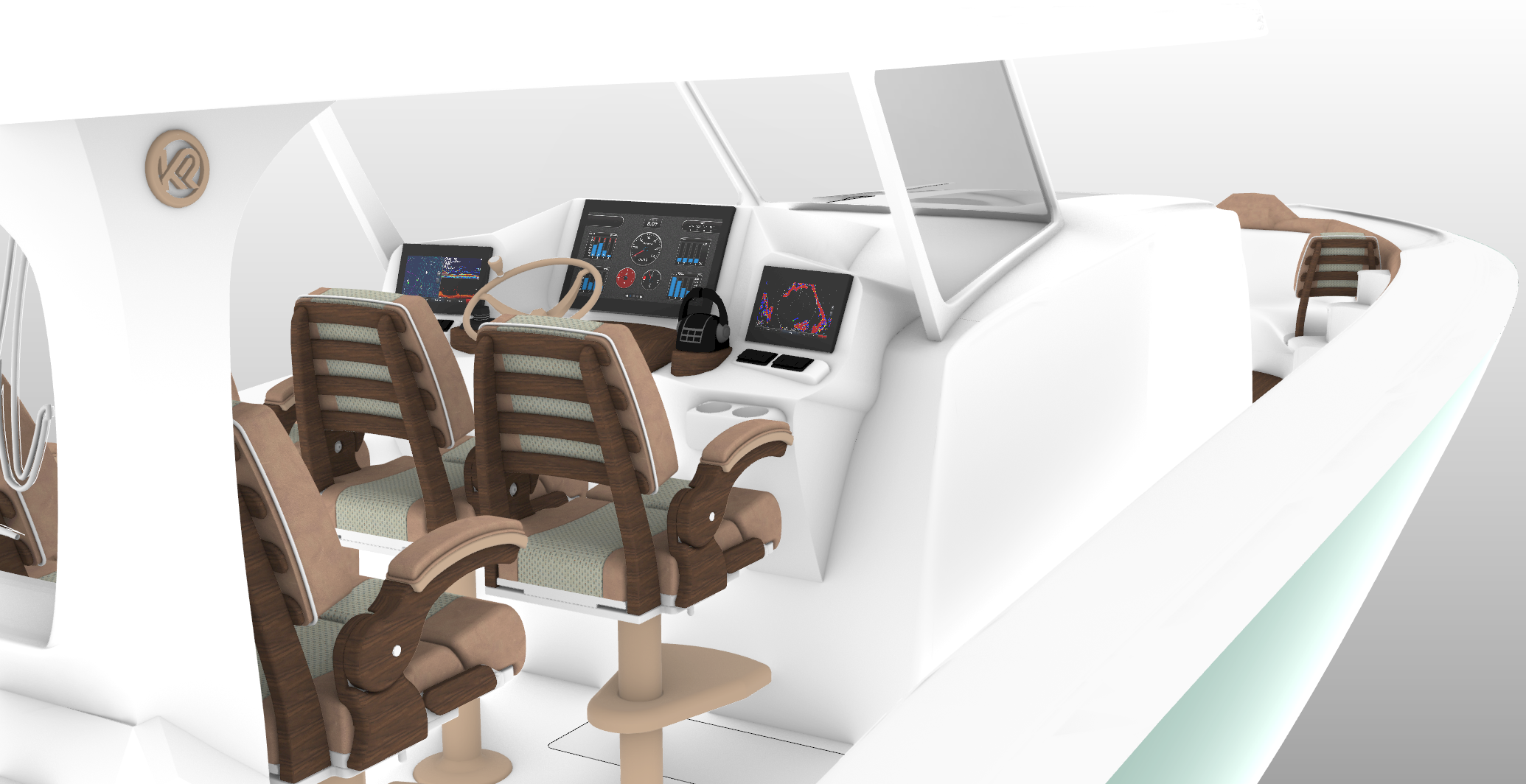 This is the L50 Astrid. Helm chairs/aft lounge chairs as well as forward seat backs and rocket launcher table credited to Release Marine.